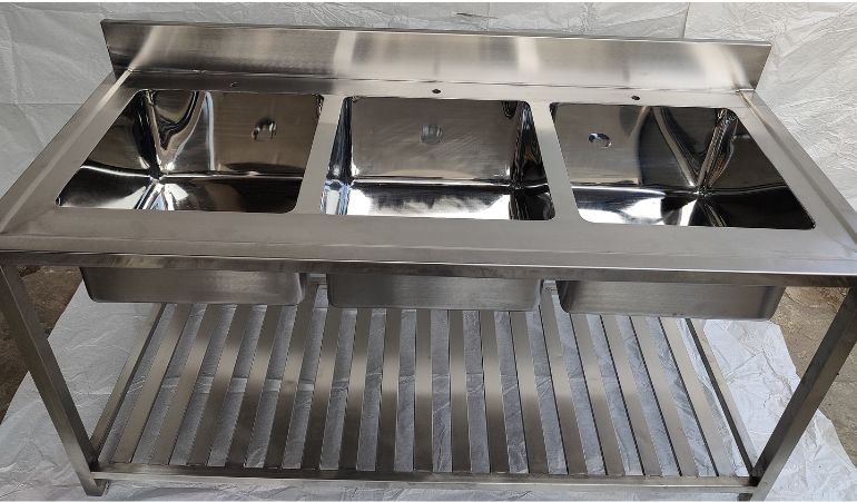 The Commercial Kitchen Three Sink Unit is a fundamental piece of equipment typically found in commercial kitchens, restaurants, and food preparation facilities. This unit comprises three separate compartments or sinks in a single structure, each serving a specific purpose. The main objective of this unit is to facilitate efficient and hygienic dishwashing and food preparation processes.