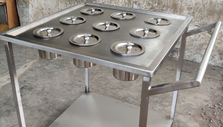 Masala trolley refers to a mobile cart or serving station commonly used in Indian restaurants to prepare and serve various spices and condiments. These trolleys are typically filled with a variety of spices, herbs, and other ingredients used to enhance the flavour of dishes. It usually consists of a metal or plastic frame with wheels and several containers or jars that can hold different kinds of masala. A masala trolley can make it easier to access and use the spices while cooking, as well as to keep them organized and fresh. There are different types of masala trolleys that you might find in Indian restaurants: Spice Masala Trolley: This type of trolley typically carries a variety of ground and whole spices such as cumin, coriander, turmeric, red chilli powder, garam masala, and more. Chutney Masala Trolley: This trolley is equipped with various chutneys and condiments like mint chutney, tamarind chutney, pickles, and yoghurt-based sauces. Fresh Herb Masala Trolley: This trolley offers a selection of fresh herbs like cilantro, mint, and curry leaves. Roti/Naan Masala Trolley: Some restaurants offer trolleys with a variety of bread options such as naan, roti, or paratha, often accompanied by flavoured butter or ghee for spreading.