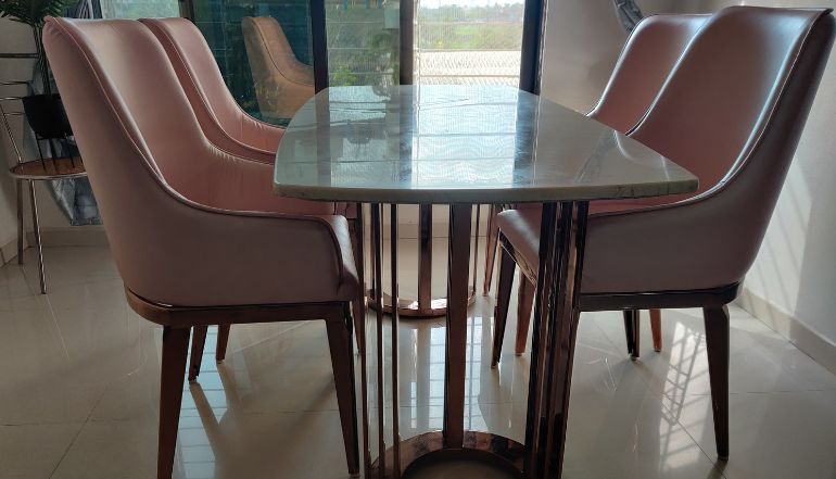 Accompanying the table, the PVD Dining Chair complements the aesthetic and design. Crafted from materials like metal or plastic, the chair receives the PVD coating as well, ensuring a cohesive and visually striking ensemble.