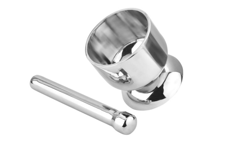 The SS Mortar and Pestle set consists of two main components: the mortar, a heavy bowl with a well-polished interior surface, and the pestle, a cylindrical tool with a rounded end. The rounded end of the pestle fits precisely into the concave interior of the mortar, allowing for effective grinding and crushing of substances.
