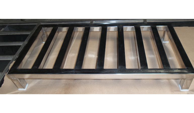 Its design often incorporates a series of steel slats or rods that form the surface of the pallet, providing support for the items placed on it. The gaps between the slats allow for airflow and easy cleaning, maintaining a hygienic and well-ventilated storage solution.